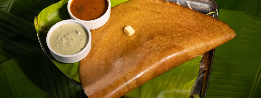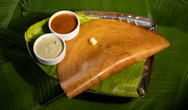 Signature chutneys and podi spread over crispy dosa, rich in butter and ghee, topped with Aloo masala